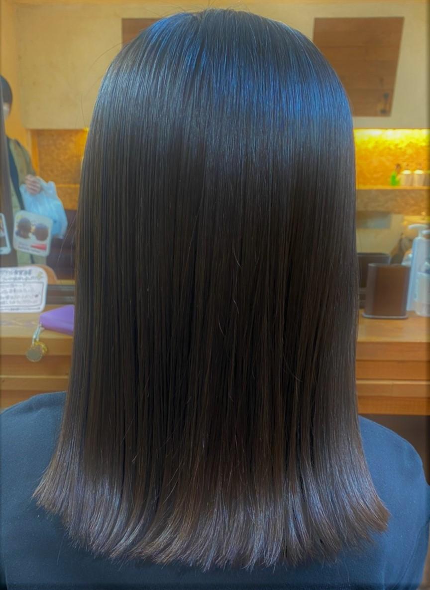 白髪染めOK!地毛のような艶髪ストレート、クセの状態やダメージに合わせて調合し使用します♪ ダメージレスカラー、髪質に合わせて減力することを実現しました♪全体の場合は+2200~3300
